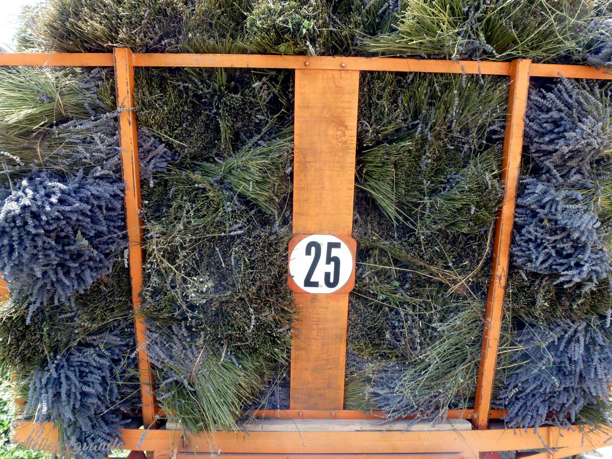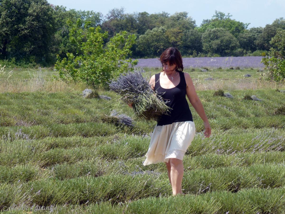 Pour nos fuseaux, nous cultivons du lavandin grosso, nous avons un petit champs bien caillouteux qui produit des petits brins, et c'est idéal pour les petits fuseaux, "les pitchouns" comme on dit ici. Pour les gros fuseaux de lavande, "les fuseaux de Marie"on prend du lavandin du Luberon ou bien du lavandin qui pousse ici à 300 m d'altitude.