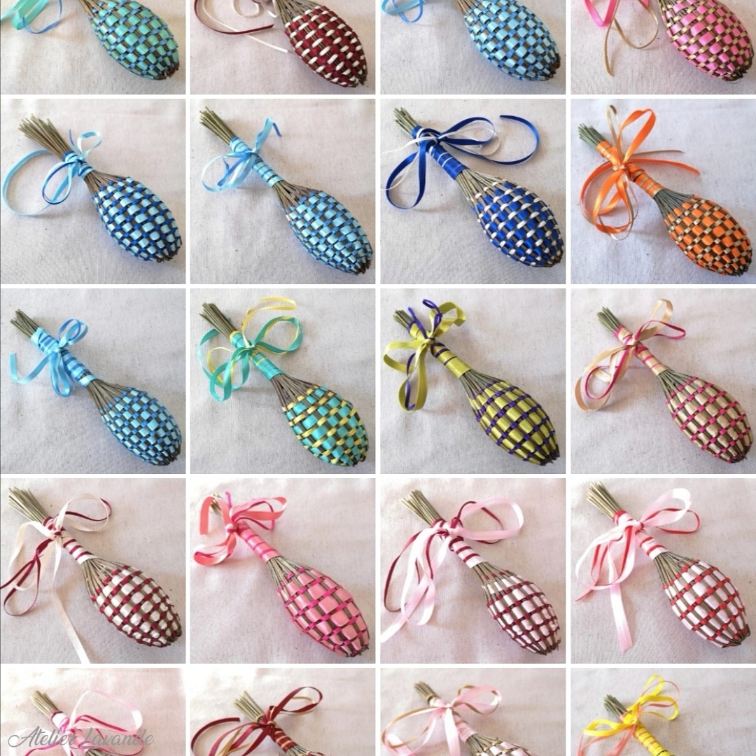 Alors j'ai pris le temps de tisser de jolis fuseaux bicolores avec 2 satins, une série de crème agrémentée d'une couleur vive, et une autre série tout en couleurs chatoyantes.