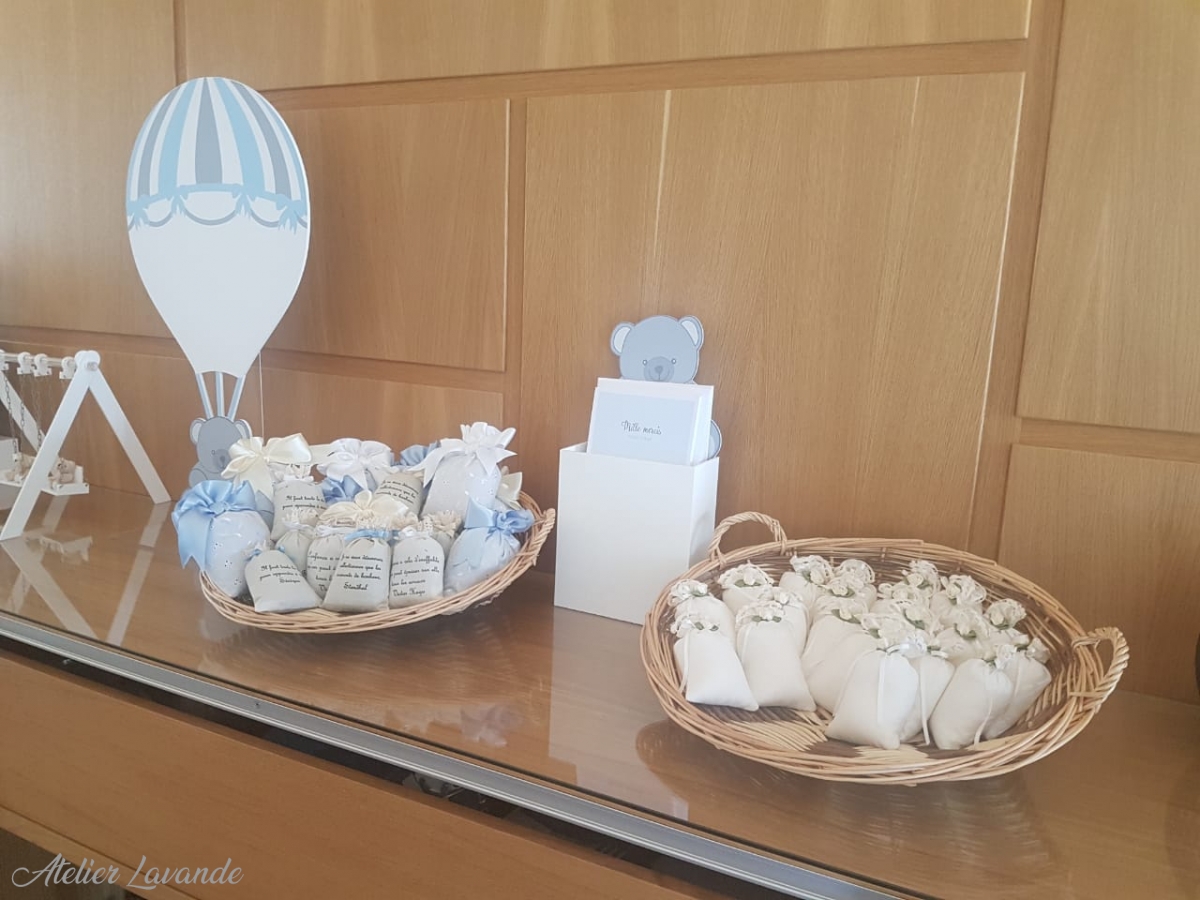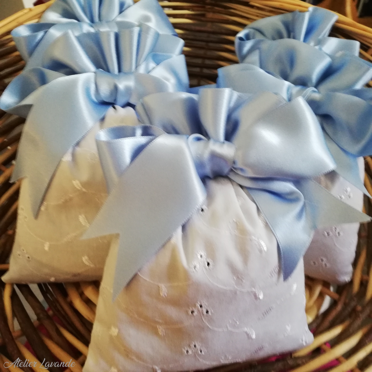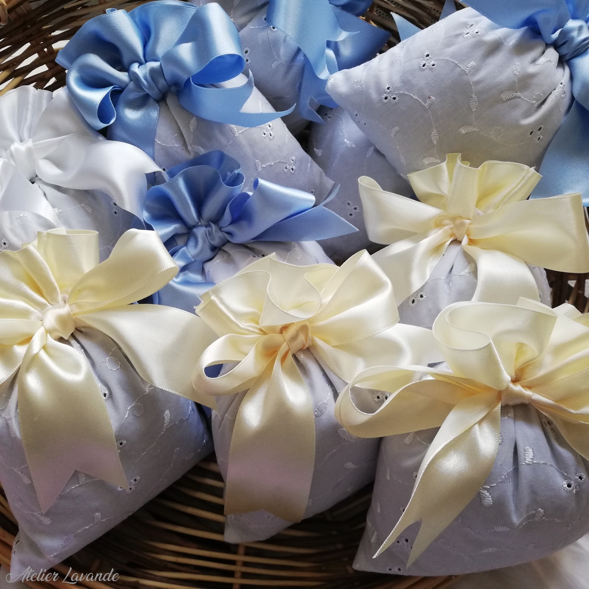 Comme ils ne souhaitaient pas connaître le sexe de leur bébé Ils m’ont demandé de réaliser de gros sachets de lavande avec un satin bleu ou jaune et aussi des sachets phrases avec des adages qui les inspiraient
