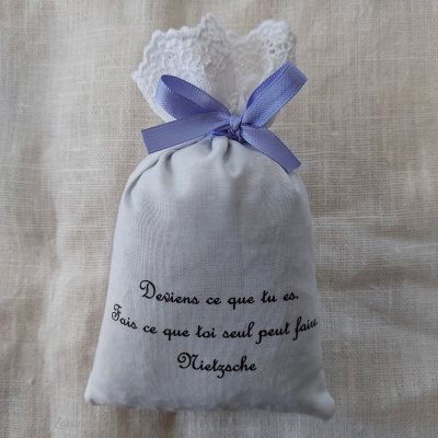 Sachet garni de lavande Bio de Provence de fabrication artisanale en tissu écru imprimé avec citation philosophique de Nietzche :