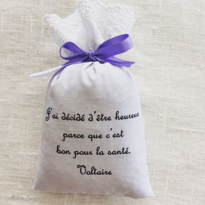 Une citation de Voltaire que l'on devrait apprendre très tôt, comme un point de mire. Un joli sachet de lavande pour parfumer vos armoires, pour éviter les mites et pour se rappeler que notre bonheur se travaille, tout cela dans un sachet de 30 g de fleurs de lavandin ! qui dit mieux !