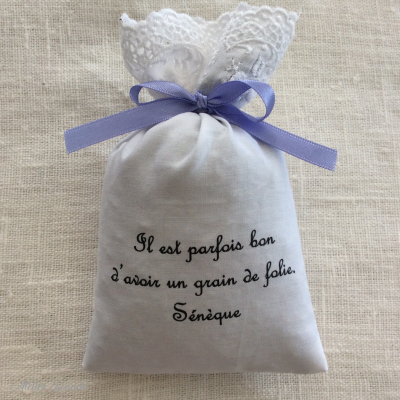 Un de mes adages préférés, un petit grain de folie à cultiver, à chouchouter ! Les sachets sont en coton écru ou blanc agrémenté d'une dentelle, ils mesurent 9/12 cm et contiennent environ 30 g de fleurs de lavandin bio