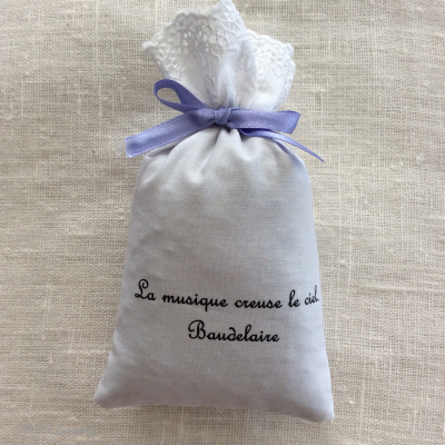 Sachet garni de lavande Bio de Provence de fabrication artisanale en tissu écru imprimé avec citation poétique de Baudelaire :