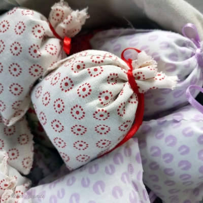 4 minis sachets garnis de lavande de Provence de fabrication artisanale en tissu imprimé à motif floral avec leur ruban satin couleur Rouge.